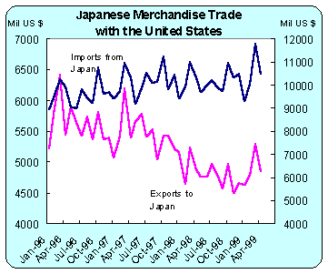 The Japanese trade report is very sensitive because of the important role that Japan plays in the world economy. The huge merchandise trade deficit with the United States raises political ire here because of limited access to Japanese markets for American goods. The graph below is based on the U.S. merchandise trade report also released this week for easier comparisons.