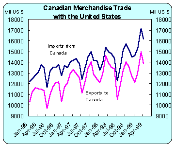 Since the inception of the North American Free Trade Agreement (Nafta) between the United States, Canada, and Mexico, trade between the three countries has grown dramatically. In May, eighty-five percent of Canadian exports went to the United States. However, a large proportion of these exports was intracompany. For example, the automobile industry exports auto components to Canada for assembly. The finished products are returned to this country for sale. Historically, there is less friction between countries when this occurs. Typically frictions occur in industries where there is no intracompany trade. Canadian trade also has benefited because the Canadian dollar has lost about 7.5 percent of its value against the U.S. dollar since the beginning of 1995 making Canadian products less expensive in U.S. markets. The graph below, again from the U.S. trade data, shows the vigorous growth in both imports and exports with Canada.