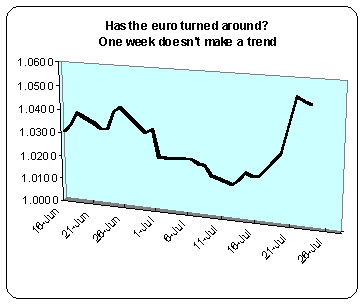 The graph above shows that the euro was rapidly approaching parity with the dollar - i.e. a one to one relationship - before last week's surge. (See last week's International Perspective and January's Focal Point for more information on the euro.)