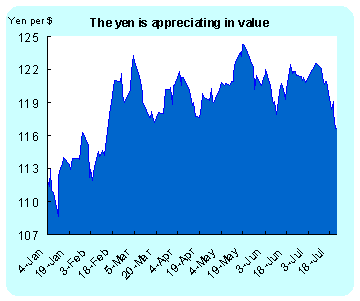 At the close on Friday, the foreign exchange rate for the yen was 116.55 to the dollar. Just last week there were over 120 yen to the dollar. Fewer yen per dollar means that the yen is rising in value.