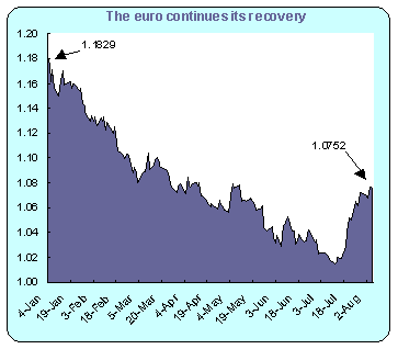 German economic data reinforced other positive survey results. Manufacturing orders rose by more than analysts had forecast. An important component of the series - foreign orders - confirmed that exports were benefiting from recovering Asian demand. The impact of the euro's weakness during the past seven months (which makes export goods cheaper) is contributing to higher foreign demand. However, unemployment continued to rise for the fifth straight month in July, but is beginning to show signs of stabilizing. Given the perennial structural labor market problems it is premature to expect a turn around for some time to come.