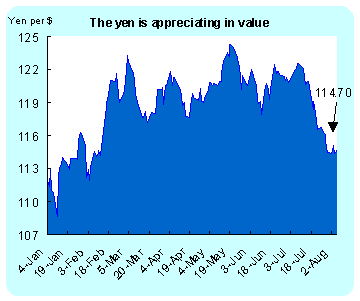 Data from Britain was positive. The Bank of England's Monetary Policy Committee (MPC) met last week and left their key interest rate unchanged at 5 percent - a 22 year low. The rate is the same as in the United States but twice the 2.5 percent rate in euroland. The Bank of England has cut interest rates seven times since last October and the consensus forecast is that their next move will be up. However, analysts don't expect an increase soon since inflation (as measured by the retail price index excluding mortgages) is below the MPC's policy target rate of 2.5 percent. There is little sign that low unemployment and rising spending is pushing inflation up. A number of important British economic indicators will be released this week. - producer prices, retail sales, July unemployment and wage costs. They should give further indications of whether the economy remains on a solid course of accelerated growth.