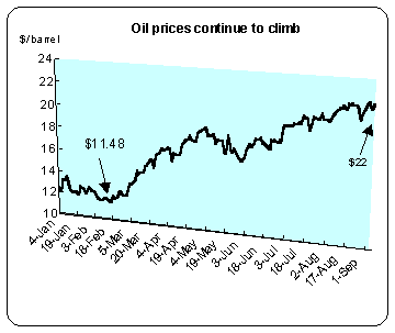 Oil The commodity markets' sensitivity was visible last Tuesday when oil prices zoomed after two oil producing country ministers indicated that they were not in favor of increasing production to meet the growing demand around the world. After a decade and a half of lying, cheating and squabbling, members of the OPEC seem to have got their act together, although most people thought it would never happen. ![]() As a result, oil prices have doubled during the past six months, much to the surprise of the biggest oil companies and their shareholders. This strength reflects a growing consensus in the oil industry - after a period of skepticism in mid-summer - that higher oil prices are here to stay. Already Saudi, Venezuelan and Mexican officials have agreed to maintain output cuts through the end of next March. The ministers' statements emphasized the crucial role that strict compliance is playing in oil's recovery along with the importance of ensuring that an expected decline in global inventories actually materializes. Although OPEC appears set to adopt a status quo approach to quotas at their September 22nd meeting, recent surveys suggest that some producers began to edge up production last month. During the week, a chorus of influential members - including Iran, Mexico and Saudi Arabia - suggested that producers monitor and react to inventory levels instead of prices as proposed by Venezuela. The oil glut is shrinking and some analysts are forecasting a substantial inventory erosion beginning in October as the heating season approaches. However, a rapid reversal is always possible in a market that depends on the resolution of a few oil ministers to avoid temptation. As the price rises, the pressure to push up earnings by producing more oil becomes ever higher. However, the severe economic difficulties of many oil producing countries, such as Nigeria and Venezuela, appear to make discipline more likely. And although OPEC countries produce only about 40 per cent of the world's oil at present, they have nearly three-quarters of reserves. A re-run of the seventies' grim story when supplies shrank, oil prices skyrocketed and inflation soared is unlikely. Inflationary pressures remain extremely subdued despite the recent rise in oil and other non-food commodity prices. A large part of the world economy is just emerging from the threat of a deflationary recession. The unexpectedly strong signs of recovery in southeast Asia and a better outlook for Europe have helped to raise the demand for oil. The buildup of excess stocks has been reversed; but this would be a benign result of continued steady growth - if it can be sustained - in most of the industrialized world. The west has become far less dependent on oil. Six years of prices above $30 (in today's money) in the early 1980s led to big changes in consumption. This reflected not only deliberate policy, such as the encouragement of smaller car engines and improvements in industrial efficiency, but also the fact that energy intensive industries have become a declining part of advanced economies. In the period after 1985, when OPEC collapsed and oil prices fluctuated between about $15 and $20, the big oil companies made spectacular efficiency gains. The cost of finding, developing and operating a new source of oil has fallen to only about $6 per barrel, less than half the figures in the mid-1980s. A barrage of indicators