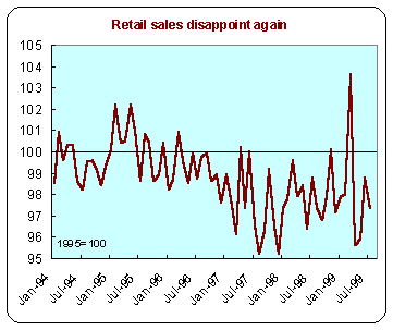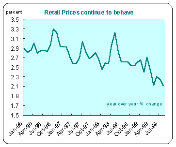 The August Retail Price Index fell to its lowest level since 1963 - 1.1 percent when compared with August 1998. RPIX, which excludes mortgage interest payments, rose 0.2 percent in August. That brought the annual rate down to 2.1 percent from 2.2 percent in July. This was below all forecasts and the fifth consecutive month in which RPIX (the Bank of England's inflation monitor) has been below the inflation target of 2.5 percent.