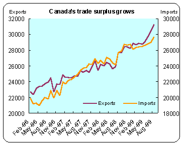 Canadian international merchandise trade balance reached C$3.6 billion, its highest level since September 1996. A vibrant automotive sector, propelled by strong North American demand, was the driving force behind increases in both exports and imports. All other sectors fluctuated only slightly, except for the machinery and equipment sector, which grew mainly because of strong imports of drilling equipment. The 2.7 percent increase in exports was almost entirely due to a robust automotive sector. Although all automotive subsectors were up, car (+21.7 percent) and truck (+15.6 percent) exports were particularly strong. Imports of automotive products continued to climb for the fourth consecutive month. Although all subsectors advanced, the strongest growth was in truck imports. The trade surplus with the United States rose to C$6.113 billion in August from a revised C$5.409 billion in July. Canada posted a deficit of C$183 million with Japan, thereby matching the C$183 million deficit the previous month, while posting deficits with all other major trading areas.