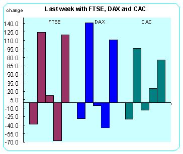 The European markets closed the week in an exuberant mood. The European Central Bank did not raise interest rates and most indicators continued to point upward, especially in the United Kingdom where the first estimate for the third quarter gross domestic product grew at a faster than expected rate. All three indexes - the FTSE (Britain), DAX (Germany) and CAC (France) regained about two thirds of the prior week's steep losses. The FTSE was up 2.57 percent, the DAX was up3.35 percent and the CAC was up 3.39 percent on the week.