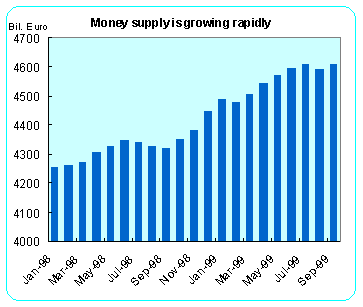 European Central Bank is poised to act... ![]() The ECB uses two major indicators when making policy. The first is the harmonized consumer price index for the European Monetary Union as a gauge of inflation. The CPI remains safely under their target rate of about two percent inflation for the EMU as a whole, although there are some member countries that are either dangerously close to the target or even above the accepted rate. With September's M3 registering a 6.1 percent annual growth rate, following hard on the heels of August's 5.9 percent jump, analysts think that the European Central Bank will use these data to justify an interest rate increase at Thursday's meeting. The Bank's M3 reference growth rate is about 4.5 percent on an annual basis. A month ago, ECB officials drew attention to M3 by warning that money supply growth and credit expansion required close scrutiny. ECB president Wim Duisenberg said at that time that the governing council is ready to raise rates once it sees signs of an improving economy. However, officials have cautioned that it would not make a rate change solely on one indicator. With the ECB still trying to establish its credibility, some think that their primary policy rate, which now stands at 2.5 percent, will be raised by either 25 or 50 basis points on Thursday.
