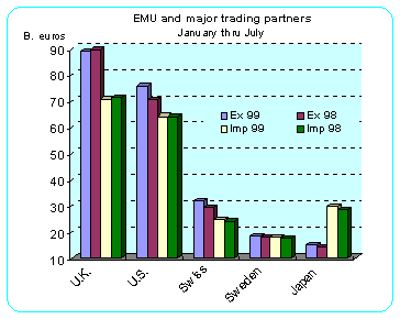 EMU ![]() August's trade surplus with the rest of the world for the European Monetary Union was 3.7 billion euros during August, down from a surplus 6.1 billion euros a year earlier. In July, the trade surplus stood at 12.0 billion euros, revised down slightly from the 12.1 billion euros surplus initially reported. Euroland exports continued to grow more slowly than imports when compared with last year. However, trade within the EMU rose eight percent when compared to last year. August EMU-11 exports were up three percent from August 1998, the same as reported in July. Imports were up eight percent when compared with last year and up from 6 percent in July. August industrial production surged more than expected when compared to a year earlier. The data suggest that the economy is growing faster than many expected. Increases were particularly strong in Italy (7.3 percent) and Spain (4.3 percent). The jump was led by the durable consumer goods sector, where output rose 11.8 percent. Durable consumer goods output was particularly strong in Italy and Germany, the laggards in the Euroland economy. In addition, August year over year output climbed 3.1 percent in nondurable consumer goods, 2.6 percent in intermediate goods and 0.3 percent in capital goods.