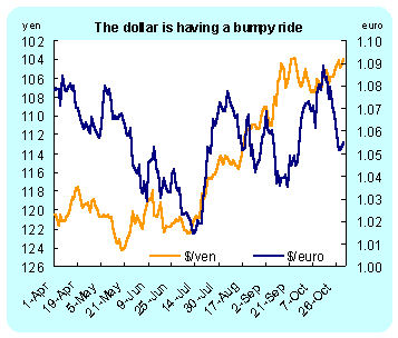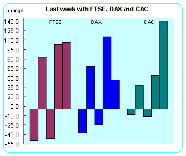 Europe ![]() France's CAC index closed the week at a new high. It gained 4.5 percent on the week on favorable economic news, especially on the unemployment front. Germany's DAX also was exuberant, closing up 3.13 percent on the week. The news from the United States had as much to do with the soaring equities markets as did domestic economic news. The EMU countries however, are fretting over a possible interest rate increase by the European Central Bank at its meeting on Thursday. Currencies ![]()