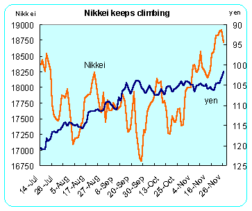 The Nikkei surged above 19,000 for the first time since August 1997 last week. However, it ended the week below that magic number at 18,914. Securities' stocks and expected reforms in the banking sector bolstered equities. The Nikkei has risen about 40 percent since January first. With foreign investors needing yen to satiate their appetites for Japanese stocks, the Nikkei is keeping the yen strong. Foreigners have been net buyers of Japanese equities for 40 of the last 43 weeks, according to figures from the Tokyo Stock Exchange.