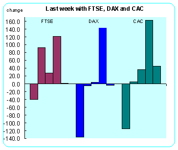 CAC - The French CAC, led by strong telecommunications and technology shares, surged upward. The index reached another new high at 5,397 by week's end.