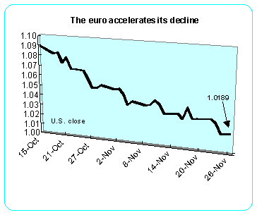 The euro was introduced at nearly $1.18 on January fourth amid buoyant enthusiasm about new opportunities in Europe's unified market. The euro's decline provided another reminder of Europe's nagging economic problems and its inability to match the relentless growth of the United States. The euro also hit record lows against the British pound, which is certain to aggravate the new wave of hostility within Britain about joining the European currency union. The euro's most drastic decline has been against the Japanese yen, which has climbed sharply against all major currencies.