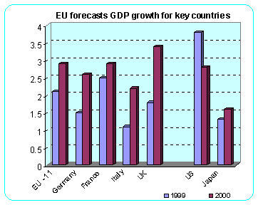 The European Union's economy will grow three percent next year, up from 2.1 percent in 1999, the European Commission forecast today. The commission predicted EU unemployment falling from a 1999 level of 9.2 percent to 8.6 percent next year and 8 percent in 2001. Inflation is expected to remain well below two percent, despite the adverse effects of high oil prices.