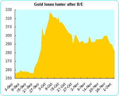 The Bank of England held the third of a series of gold reserves sales on Monday. The Bank auctioned 25 tons of gold reserves. The auction price of $293.50 a troy ounce was marginally higher than the market price before the announcement of the disposal plan in May. But it was $3 below the previous afternoon's London fix. AngloGold, the world's largest gold mining company bought almost 40 per cent of the stocks on offer. The next gold auctions are scheduled for January 25, 2000, and March 21, 2000. Spot gold fell $2.00 immediately after the announcement. Gold closed the week at $282.40, down $17.10.