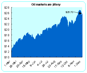 Crude oil prices fluctuated during the week amid conflicting information about whether Iraq would accept an extension to its oil for food plan with the United Nations. Suggestions that the Organization of Petroleum Exporting Countries (OPEC) might relax its output restrictions if U.S. prices remained above $25 a barrel also roiled the market. However, reassurances from Kuwait and Algeria that the OPEC cuts would extend beyond their original expiry deadline of March 2000 helped sentiment. In New York light crude ended the week at $25.70 a barrel. Increased oil prices have boosted the stock of the world's leading oil companies along with shareholder earnings. However, the higher oil prices are putting an upward pressure on price indexes in just about every country.