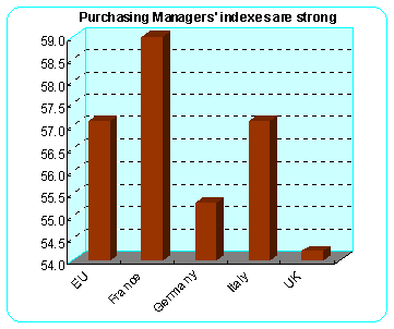 The first week of the month brings with it an onslaught of purchasing managers' surveys and sentiment surveys in Europe. This week was no exception. To sum up, the results were similar across Europe. The indexes remained steady. Euroland remained at 57, with Germany, France and Italy standing at 55.3, 59.4 and 57.1 respectively. A key to understanding these surveys is that a level above 50 indicates expansion, while a level below 50 indicates contraction. The overall and manufacturing indexes were above 50 and climbing. However, so were the price subindexes.