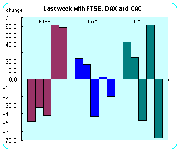 Both the London FTSE and German DAX ended the week lower, in spite of a renewed wave of optimism about technology stocks. The FTSE edged down 2.7 points on the week to 6739.5 while the DAX was down 21.27 points at 6097.9. The DAX was roiled by merger activity as sentiment about them swayed and profit taking emerged.