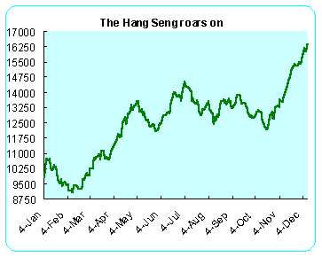 The Hong Kong Hang Seng index vaulted 540 points last week to close at 16380 - its highest point in almost 28 months. Growing optimism that the territory's economic recovery would gain further momentum and help boost corporate earnings buoyed the index. The index was helped by substantially better than expected 4.5 per cent growth in third quarter gross domestic product. The bilateral agreement signed by China and the United States, to pave the way for China to enter the World Trade Organization, further brightened prospects for many Hong Kong companies doing business on the mainland. Exuberance was muted on Friday when investors became concerned about possible inflationary trends in the United States prior to the producer prices indexes release.