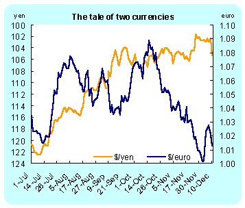 The yen fell against the dollar when ambiguous gross domestic product data showed that the economy unexpectedly contracted in the third quarter. However, growth in the previous quarter was revised up sharply. The strong yen has not yet had any identifiable negative impact on the Japanese economy or its outlook, according to Sakuya Fujiwara, deputy governor of the Bank of Japan. So far the negative impact of the yen's appreciation on exports has been mitigated by the recovery of overseas economies.