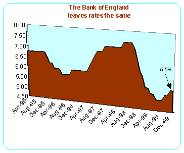 The Bank of England left interest rates unchanged as expected. The Bank's Monetary Policy Committee (MPC) recommended that the base rate - the short-term rate at which the Bank will lend to other financial institutions - at 5.5 percent. The base rate sets the level of interest rates for business and personal borrowing. The MPC had increased rates by 25 basis points in September and again in November. The major deterrent to an increase was Y2K. However, a case could have been made to either raise interest rates or keep stable based on recently released economic indicators. Many analysts expect to see it rise further to about 6 percent early next year.