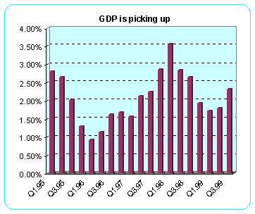 Seasonally adjusted third quarter gross domestic product increased 0.7 percent on the quarter and 1.3 percent on the year. Both first and second quarter GDP were revised upward. Details indicate that consumer spending, government spending and investment showed a strong rebound in the third quarter after falling off in the second quarter. In addition, net exports continued to accelerate, contributing to third quarter growth. Only the inventory change had a negative contribution although the deceleration in stock growth suggests production will have to be boosted to meet stronger demand.