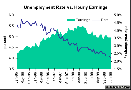 Bottom Line The Federal Reserve resumed its tightening stance in February after a brief pause. They figure that rates are going to have to go higher before consumers actually take notice. The latest spate of data supports more Fed rate hikes in the near term. Most economists are predicting a minimum of three rate hikes for the year – some are looking for four. Just about everyone recognizes the fact that it is an election year and rate changes will likely stop by mid-year (barring a serious acceleration of inflation). While the economic data support at least a couple more rate hikes in the near term, there is no reason for the Fed to pursue a more aggressive policy. The gradualist approach should work well for the first half of 2000. After all, while some of the survey figures are showing higher prices for raw materials, average hourly earnings are not accelerating. Looking