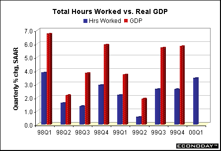 surge weather-related – but still strong The robust nature of the employment report can’t be dismissed so easily, though. Even if we only assume that construction would have grown at the average pace of the past several months, this still would have yielded a payroll gain in excess of 300,000 per month – and faster than predicted by economists. Gains were widespread among the various categories. Only finance, insurance and real estate even posted a decline for the month. The chart below shows that the three-month moving average is on a growing trend – not a moderating one – and stands at its highest level since December 1997! The civilian unemployment rate edged down to 4.0 percent in January and now stands at its lowest level since January 1970 when the rate was 3.9 percent. Both employment and the labor force grew by roughly similar amounts during the month. The Labor Department also started to seasonally adjust the size of the labor pool this month. This indicator, a favorite of Alan Greenspan’s, was previously available only on an unadjusted basis. The Labor Department’s series showed a drop of 214,000 in January in the pool of available labor. Any movement in a downward direction can only be viewed negatively by the Fed chairman. Despite the drop in the unemployment rate, average hourly earnings didn’t accelerate on an annual basis. Earnings rose 0.4 percent in January, but were 3.5 percent higher than a year ago, the same as last month. The bottom-line on the employment situation? Despite mild weather conditions, there is no getting around the fact that economic momentum is going gangbusters. The combination of private sector employment and the average workweek can serve as a proxy for GDP growth. The chart below looks at the growth in total hours worked in the economy (private payrolls times the average workweek) and shows its relationship to real GDP. The missing link between the two series is productivity, which caused real GDP to increase at a more rapid clip than total hours worked during this time horizon. Note that the total hours worked in January expanded more rapidly than the previous seven quarters! Even if February and March employment and hours moderate, the stage is already set for faster growth! How can the Fed ignore this? Another interest rate hike at the March 21 FOMC meeting is practically in the bag – and maybe so is a rate hike at the May 17 meeting as well! Manufacturing