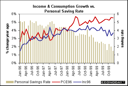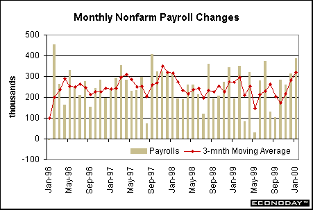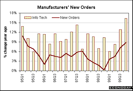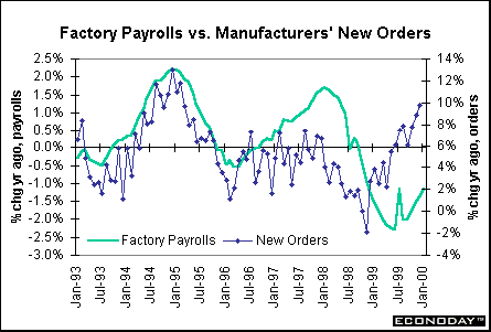 boom Although manufacturers’ new orders have generally been on a rising trend for the past couple of years, a similar pattern has not emerged in the payroll data. On a year-over-year basis, factory payrolls are still running well below year ago levels. However, a new upward trend in these payrolls may suggest that the bleeding of workers has stalled over the past few months. Yet to some extent, orders rising faster than payroll has to reflect the sharp productivity gains made in the manufacturing sector in the past few years. The bottom-line on manufacturing? Until the second half of 1999, the manufacturing sector was pretty much the poor relation in the U.S. economy. The sector then took off as momentum built through the end of the year. The surge in new orders in the fourth quarter generally guarantees that industrial production growth will expand at a healthy pace in the first half of 2000. Unfilled orders, a more reliable but less well-known series than new orders, confirms that the turnaround in manufacturing is likely to be sustained for more than just a couple of months. Like