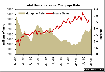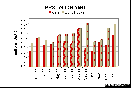 the battery bunny, the consumer keeps on going Some economists and market players were claiming that the three rate hikes engineered by the Federal Reserve in 1999 had absolutely no impact on the consumer. That’s not entirely true. Home sales have clearly, though modestly, moderated their pace. New and existing home sales did peak in the first half of 1999. The Fed initially raised its funds rate target at its June 1999 FOMC meeting. Mortgage rates also ticked higher in the second half of the year as the Fed pursued a tighter monetary policy. Market participants correctly anticipated that the Fed would raise rates at its February FOMC meeting. As a result, the 30-year fixed mortgage rate increased in January to about 8 ¼ percent. The decline in home sales should eventually lead to declines in spending on furniture, appliances and home furnishings. While rising interest rates affected the housing market in the second half of the year, the same can’t be said about other interest-sensitive sectors. Motor vehicle sales jumped in January as domestic cars were sold at a 7.3 million-unit rate and light trucks at a 7.8 million-unit rate. As evident in the chart below, this surpasses the sales pace of the past several months. It seems that interest rates are just not high enough yet to hamper spending on cars and trucks. The bottom-line on the consumer sector? U.S. consumers really are like the energizer bunny – they keep going and going. But eventually, a rising interest rate environment will stall this sector. The slower level of home sales is bound to constrain expenditures on durable goods. The Conference Board’s buying plans survey did show that consumer plans for auto purchases over the next six months have come down. It will take more than one month of stock market data to frighten investors, but the greater volatility in the market combined with (perhaps) slower stock gains might lead consumers to curtail their spending due to concern over their wealth. The