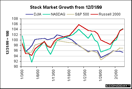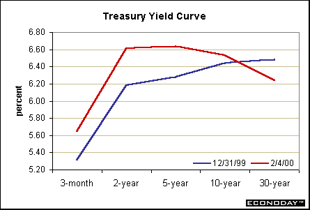 yield curve defies explanation To say that the Treasury bond market rallied would be an understatement. Moreover, not all maturities across the spectrum moved by the same magnitude. On Wednesday, the yield on the long bond fell 13 basis points; on Thursday, it fell an additional 15 basis points. This brought the 30-year bond yield down to 6.14 percent by the market close. This two-day drop is not revealing the entire story. Ever since the Treasury announced the buyback program a couple of weeks ago, long bond yields have declined. On January 20, just three weeks ago, the long bond yield peaked at 6.74 percent! Bond traders and hedge fund managers have been scrambling to find 30-year paper. In fact, the drop in bond yields has so dramatic over the past couple of days that markets were abuzz over rumors of financial crises at hedge funds and large bond houses. The change in supply conditions has created a sharply inverted yield curve. The yield on the 30-year bond is below yields for 2-year, the 5-year and 10-year notes. In fact, it is only barely above the yield on the one-year bill! The short end of the curve (from the 3-month bill to the 2-year note) reflects a rising interest rate environment – coming partly from the tighter monetary policy. In the past, market players could look to the longer end of the Treasury curve to indicate the prospects of inflationary expectations. The 30-year bond is clearly out as a benchmark security. In today’s environment, it wouldn’t be entirely useful to look at even the 10-year note as an indicator of economic fundamentals. Technical factors are simply outweighing everything else. One would think that the general drop in interest rates in the Treasury yield curve helped bond markets everywhere. Unfortunately not. Corporate bonds and agency securities suffered in the past week as everyone scrambled to hedge positions and find Treasuries. It will take more than a week to figure out what the Treasury curve can tell us going forward. Markets at a Glance
