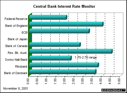 The European Central Bank and the Bank of England cut their benchmark interest rates by 50 basis points each. The ECB lowered its rate to 3.25 percent, the fourth reduction this year and only the fifth since the bank took control of rates in January 1999. The ECB, which has reduced rates by 150 basis points so far this year, last cut rates on September 17 in a concerted move with other major central banks in the wake of the September 11 terrorist attacks. The ECB is accelerating rate cuts as the likelihood of a U.S. recession threatens to shrink the region's already weak economy even more. EMU growth was an anemic 0.1 percent in the second quarter. Fourteen percent of Europe's exports find their way to the United States.