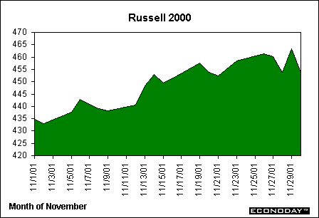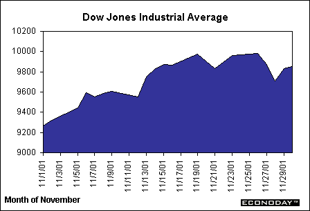 Equity investors began to see a brighter picture in the month of November. Optimistic market players sent major indices back towards pre-September 11th levels on the hopes of a possible economic recovery in the next six months. With a mixed bag from economic indicators, market players looked towards slight gains in corporate earnings and the success of the war effort in Afghanistan as hopeful signs. Despite the fact that consumers are not fully buying this recovery, market players are hopeful that the coming retail-intensive holiday season will bring customers back into stores. Most of the major indices achieved nice gains throughout the month mostly on the strength of investor-optimism. The Dow neared the 10,000-point level a few times late in the month, but then moved slightly backwards as November ended. The NASDAQ continued its solid performance from last month, as the technology sector gained throughout the month.