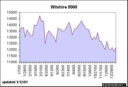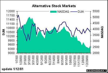 The stock market is off to a rocky start this year, surging on a surprising rate cut by the Fed and sinking back on poor corporate earnings. This week, market players appeared to ignore earnings warnings as the NASDAQ composite managed its big (yet brief) winning streak. Most major averages slipped Friday, and the Dow once again under performed the Nasdaq composite. For the most part, stock investors have decided that profit figures are going to be soggy through the first half of 2001. Any news that supports growth in the second half of this year is viewed favorably. Market players are also concluding that the Fed will probably lower rates by only 25 basis points at the end of the month instead of by 50 basis points, a popular expectation earlier in the week.
