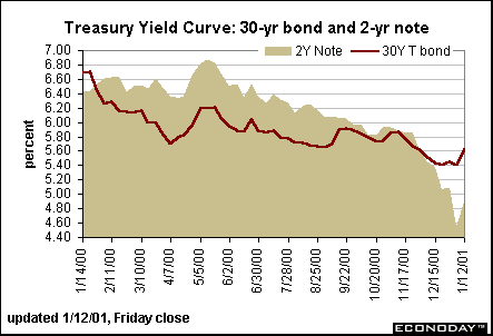 Treasury yields surged today in a shortened trading day schedule (in anticipation of the Martin Luther King holiday on Monday). The headline figures on inflation were higher than expected while headlines on retail sales were stronger than expected. To bond investors, the reports pointed to stronger growth with inflationary pressures. But a close look at the data shows that retail sales were soggy and should have been friendly news for the bond market. Similarly, a higher core PPI was due mainly to motor vehicles, sales for which are plunging and incentives around the corner. Moreover, there was no inflation in the pipeline. Nevertheless, it seems that bond investors thought the figures were "simply horrid" and thus concluded that the Fed would not act aggressively at the January 30-31 FOMC meeting. Bond players are now pricing in a 25 basis point cut at the end of the month rather than a 50 point reduction. The price collapse in the bond market may have been overdone on Friday. The yield on the 30-year Treasury is 23 basis points higher than a week ago! At the same time, the 2-year note yield is up a whopping 33 basis points! Perhaps the bond market rallied too far last week and the pendulum swung way to the other side this week. There will be room for correction in the next couple of weeks as more economic data comes out.