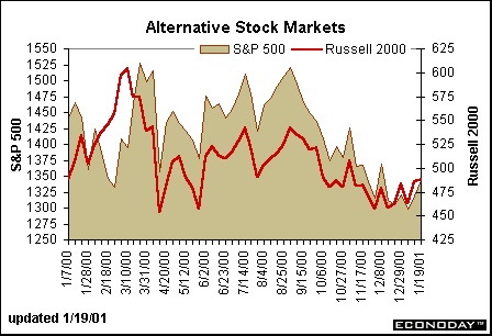 Despite warnings of poor earnings performance among many industries, the NASDAQ composite managed to post pretty good gains for the second straight week. On Tuesday, the composite index dipped slightly but solid gains were posted on Wednesday and Thursday. In contrast, the Dow Jones performance has been choppier since the beginning of the year. Except for a couple of days surrounding the Fed's surprise rate cut, the Dow Jones Industrials have traded below year-end (December 29, 2000) levels through the first three weeks this year. It has also fallen behind other major indexes besides the NASDAQ, including the S&P 500 and Russell 2000.