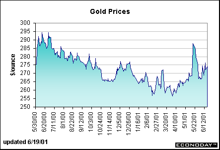 The chart below depicts daily gold prices over the past year. Prices generally fell over the course of the year until May. The weaker prices came at the same time that consumer prices were showing signs of acceleration. Yet gold bugs (those who claim that the price of gold reflects the truth about the economy and inflation, such as former Fed Governor and current Bear Stearns Chief Economist Wayne Angell) could point to declining gold prices as proof that inflation was not a problem in the U.S. economy. Declining gold prices could also indicate weaker demand for gold in general as well as for industrial use. All this together would suggest softer economic activity. Indeed, history shows that gold prices fall during recessions. If recent price gains are sustained or if gold moves up further, it could mean that economic conditions are improving and economic growth will accelerate in the second half of the year. An important caveat not to be missed: gold is an international commodity. Prices reflect global demand, not just U.S. demand. Thus, one shouldn't make quick conclusions from small data movements.