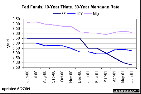 One would expect mortgage rates to move in tandem with the federal funds rate, but mortgage rates are tied to Treasury yields. The yield on the 30-year fixed rate mortgage loan did move down in the second half of 2000 with the yield on the 10-year note. It fell slightly in early 2001, as did the 10-year note. But notice that the 10-year note yield (and the mortgage rate) was no longer affected by the declining federal funds rate target after March.