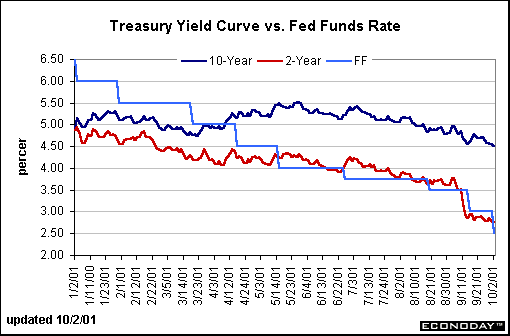 In the beginning of the year the Treasury market had anticipated Fed policy, so that early rate cuts were not accompanied by similar declines in Treasury yields. After the first quarter, the 2-year Treasury note yield showed some signs of declining, but the yield on the 10-year Treasury note actually increased on the prospect that inflationary pressures would percolate with the aggressive Fed easing. As inflation fears eased, yields began to come down in unison across the spectrum of maturities. The terrorist attacks on September 11 caused yields to tumble as investors fled to the safe-haven of Treasury securities. After the stock market re-opened for trading, yields fluctuated in a wide range as investors tried to weigh the evidence. Safe haven status puts downward pressure on Treasury yields, as does the prospect of an imminent recession. Putting upward pressure on rates were budget worries, concern that the U.S. Treasury, to meet government spending needs, would increase borrowing at a time of economic weakness and low tax receipts. In the past week, yields generally declined on the bearish outlook for the economy.