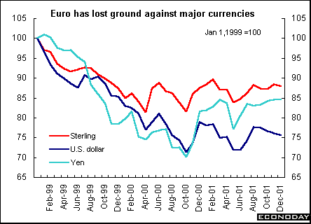 The graph below shows how the euro has fared in its short life against the U.S. dollar, pound sterling and yen. It has lost ground to all three. Against the dollar, the euro has lost 24.4 percent of its value, 12.2 percent against the pound, and 15.5 percent against the yen.