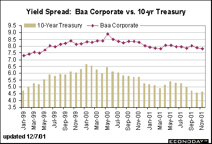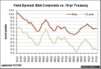 Yields on Baa corporate bonds are down from their peak reached in May 2000, but are hardly unchanged despite rapid declines in the Treasury market. The less optimistic outlook for the economy tends to hurt lower-rated bonds since the risk of default is heightened with reduction in corporate revenues.