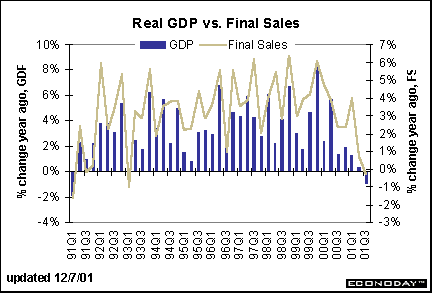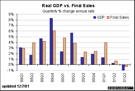 Real GDP declined at a 1.1 percent rate in the third quarter of 2001, the largest decline since the recession of 1990-91. Real final sales edged down at a 0.3 percent rate during this period. The National Bureau of Economic Research officially declared March 2001 as the peak of the business cycle - meaning that the current recession began in April.