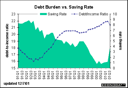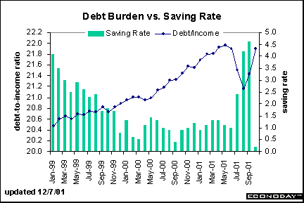 The saving rate plunged to 0.2 percent in October because zero percent financing offers caused motor vehicle sales (and durable goods) to spike in October. Since the entire purchase of the car is counted in the month of the sale, it looks as though consumers used up all their savings. Actually, this is a statistical anomaly. The personal saving rate will likely return to levels seen early in 2001 over the next couple of months. The debt-to-income ratio is back to its trend after being depressed for a couple of months because of higher disposable income levels coming from tax rebates.