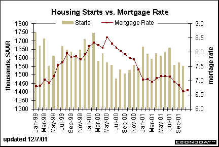 Housing starts remained roughly at the same level from August through October even as mortgage rates dropped. Between the beginning and end of November, mortgage rates jumped, although the monthly average shows only a minor uptick from October.