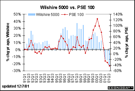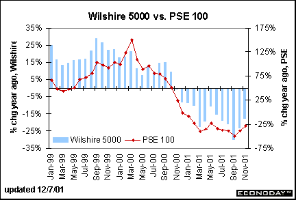 The year-over-year declines in the Wilshire 5000 and the PSE 100 were slightly smaller in November than in October.