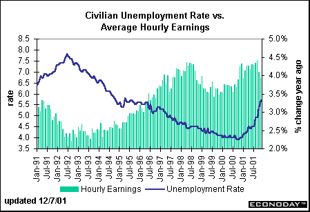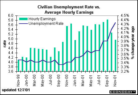 The civilian unemployment rate increased 0.3 percentage points to 5.7 percent in November. Average hourly earnings rose 3.9 percent during the month, the smallest gain since January. Most economists expect that a mild recession will lift the unemployment rate near 6 percent in coming months.