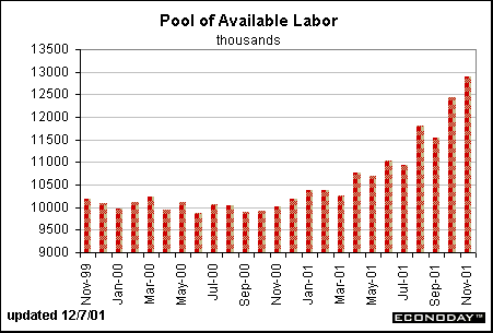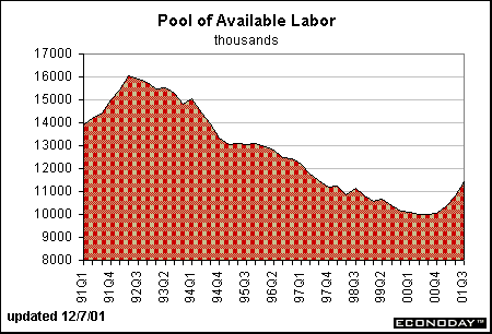 The pool of available labor continued to climb. Notice that the upward trend in the pool of available labor began about the same time that the unemployment rate started to edge higher - both bottomed in September-October 2000. This indicator takes a backseat to other indicators these days given that labor demand issues are more important than labor supply when the unemployment rate is rising.