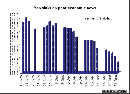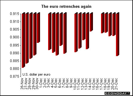 The euro weakened on a combination of comments by European Central Bank president Wim Duisenberg plus a mix of weak economic data and forecasts. Besides these factors, the euro suffered from whiplash on euro/yen cross trading. Duisenberg dashed the hopes for an ECB interest rate cut early next year. In testimony to the European Parliament, he said the ECB now sees rates as appropriate for the "foreseeable future", a phrase which signals that rates will be on hold for the next several months. His comments make it clear that barring a major shock - such as a rapid appreciation of the euro exchange rate - the Governing Council will need at least several more months' data to convince them of the need for further easing. The ECB's stand isn't made easier by the far gloomier prospects for Europe compared with the United States. In addition, structural reforms are long overdue and there is the prospect of new countries entering the EU in 2004.