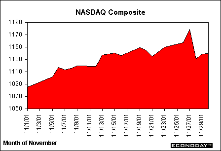 Some days of the month were particularly strong, especially in the first few days of November. Market players sent indices rushing forward as early as the 1st of November, which saw a 188-point gain on the Dow. By the third week of November, the holiday week, the Dow was pushing the 10,000-point level while the NASDAQ continued to gain back the momentum it had lost since September 11th. November 6th was also a good day for equity indices as investors received another Fed rate cut. As November drew to a close, markets began to taper off, losing some steam after the Thanksgiving holiday. Market players continue to hope that equities have bottomed out, but the final days of November brought some more negative economic news and a slight sell-off sent indices down from their high levels for the month.