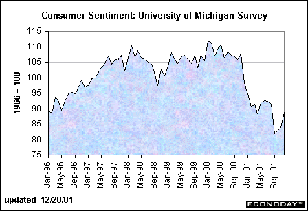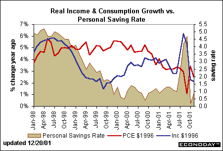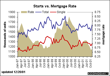 Notice the little uptick in the mortgage rate in November. On average, mortgage rates were up only 4 basis points from the previous month to 6.66 percent. However, don't expect such good news for December. The three weeks of December are already averaging a 7.03 percent rate, up 37 basis points. This is ironic in light of the 475 basis points reduction in the Fed's funds rate target. Typically, Federal Reserve easing helps spur economic activity during a recession, first through the housing market because it is so sensitive to interest rate changes. The Fed eased far more than is evident by the modest 200 basis point drop in mortgage rates from a mid-2000 peak to a low point a couple of months ago. Furthermore, it is likely that rates will inch up rather than decline in the next couple of months based on the sharp upward movement in the U.S. Treasury market. As a result, housing may not be the impetus behind economic recovery in 2002. This will dampen the strength of the recovery.