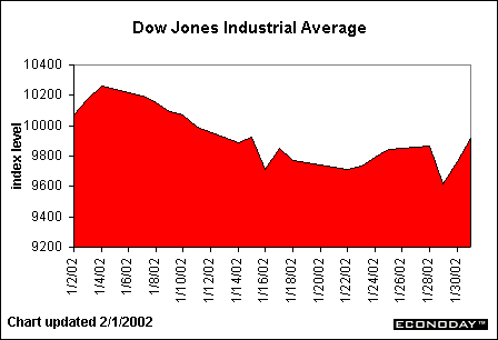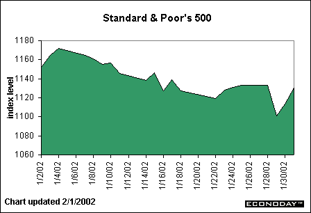 Some days of the month were particularly strong, mostly the last two days of January. Market players kept the Dow above the 10,000-point mark for only the first few trading sessions of January, and then stayed below this key level for the rest of the month. Mixed corporate earnings grounded investors, and pessimists again dictated the market's movement for much of January. As the month drew to a close, a few more companies reported bankruptcies and losses accompanied the same shady accounting practices which led to the Enron fiasco. January 29th brought all the nervousness from market players into trading, as major indices reported heavy losses. Investors were worried that more big names were following in the footsteps of Enron with regards to their accounting practices. This was followed by the FOMC announcement, which left interest rates unchanged and was a positive move for equities. The last two trading sessions of the month recovered the losses of the 29th as optimistic investors again hope for an earlier economic recovery. Days of decline outnumbered days of increases, a reversal from December's positive trading. The Dow closed the month with a loss of 1.0 percent, while the NASDAQ recorded a decline of 0.9 percent. The S&P 500 also decreased, finishing down 1.6 percent for January. The Russell 2000 recorded a loss of 1.1 percent, while the market encompassing Wilshire 5000 index decreased 1.3 percent in January.